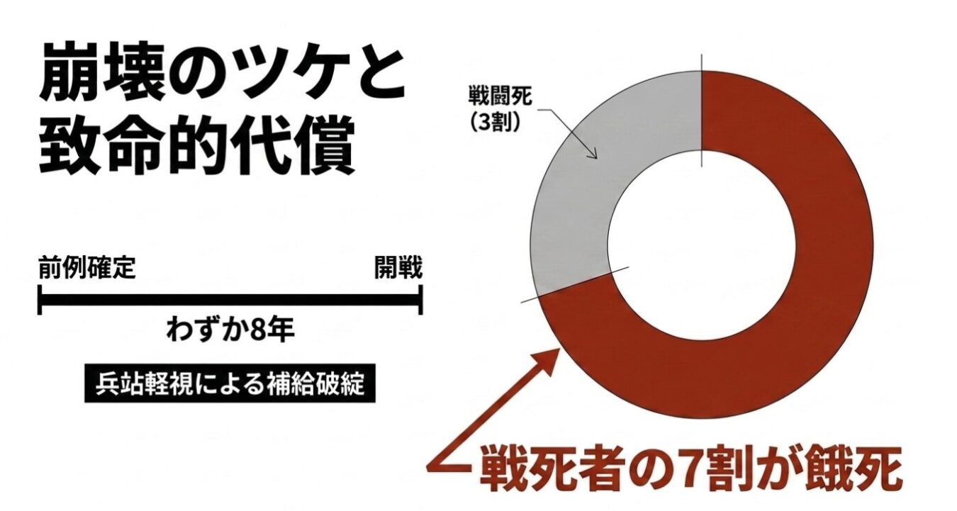 「崩壊のツケと致命的代償」という見出しの下に、前例確定から開戦までの「わずか8年」という期間と「兵站軽視による補給破綻」を示したタイムライン、および戦死者の7割が餓死(3割が戦闘死)であることを表すドーナツグラフが記載されています。