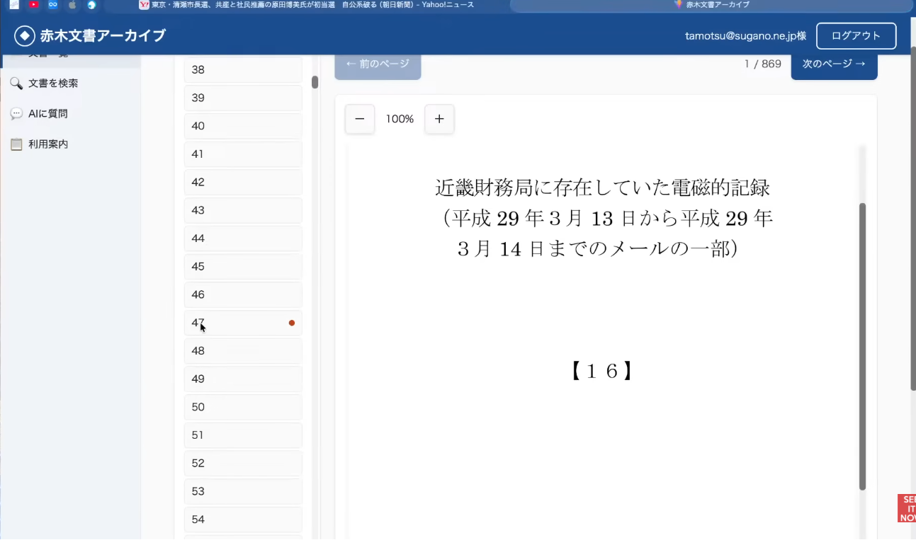 財務省本省から改ざんを強要され、自ら命を絶った赤木さんが遺した約12万ページにも及ぶ資料。国が順次公開しているこの資料の1ページ目、すなわち赤木さんが休職に入る直前、業務として最後に取り扱ったメールの内容は、他ならぬ「私(菅野)に関する情報」であった。この衝撃的な事実を突きつけられ、意図せぬ形とはいえ自分がその最期に関わっていたと知った時、私に逃げ出すことなどできるはずがなかった。この12万ページに刻まれた真実を、誰もが検索し検証できるシステムを作らなければならない。その使命感だけが、私を突き動かしたのだ。