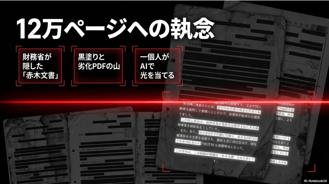 財務省が公開した「赤木文書」。公文書改ざんを強要され自死した赤木俊夫さんが遺した、約12万ページにも及ぶ膨大な資料群である。しかし、国が公開したデータは、あえて「デジタルデータを一度紙に印刷し、それを再びスキャンする」という、検索逃れとしか思えない不自然な劣化処理が施されたPDFファイルの山だった。通常の検索すらままならないこの巨大なブラックボックスに、一個人のエンジニアがいかにして光を当てたのか。