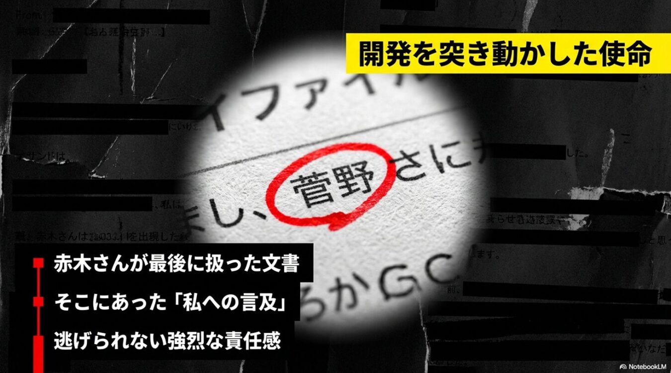 1. 12万ページへの執念と「私」の責任感:赤木さんが休職直前に最後に扱った業務メールが、他ならぬ配信者(菅野氏)に関する情報であった。その重い事実に直面した圧倒的な責任感が、約2ヶ月間にわたる独自システム開発の原動力となった。