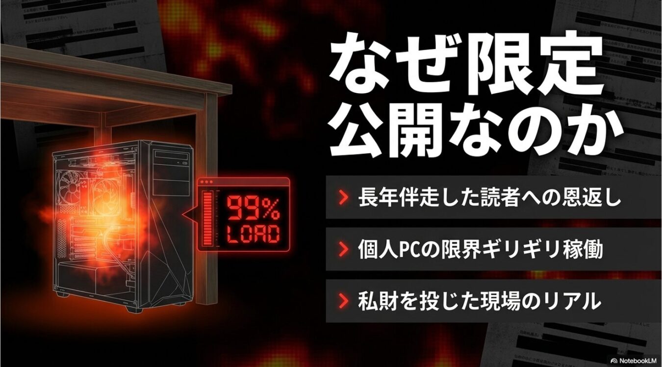 理由は2つある。1つは、2017年から延々と続く「森友問題」という長くて暗い旅路に、文句も言わずに付き合ってくれたコアな読者にこそ、最初にこの成果を提供するのが筋だからだ。そしてもう1つは、背に腹は代えられない切実なインフラ事情である。現在、約89,000ページのデータをAIにクロールさせ、私の足元にあるローカルPCで必死に処理を回している。配信中にシステムが重くなるほどギリギリの負荷で稼働させているため、不特定多数のアクセスに耐えられるわけがない。これは私財を投げ打って構築した「現場のリアル」なのだ。