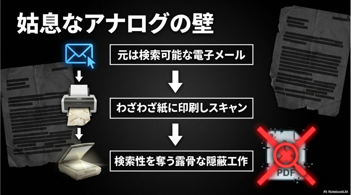 本来ならデジタルのまま公開すれば一瞬で検索できるものを、アナログに落とし、また無理やりデジタルに戻す。これは意図的に検索性を落とし、真相に辿り着かせないための露骨な隠蔽工作、いわば「デジタル→アナログ→デジタルの壁」である。