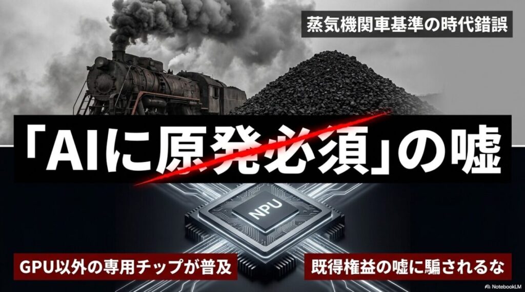 3. 「GPU至上主義」と原発推進の大嘘:テキストデータのやり取りにすぎない処理に、莫大な電力を消費するGPUを大量投入する現状は「ショベルカーにスプーンをつけてカレーを食べる」ような異常事態である。数年以内にAI専用チップが普及すれば電力問題は解消されるため、これを口実とした原発再稼働論は完全に破綻している