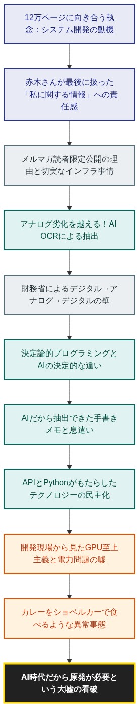【結論】 財務省の隠蔽体質を打ち破るべく、執念で開発された「赤木文書システム」は、AI技術を駆使して赤木さんの「手書きメモ」という生きた痕跡(息遣い)を抽出することに成功した。さらに、自らの手でAI開発の現場に立った視点から、現在のAI市場にはびこる「GPU至上主義」の異常性を暴き、「AIで電力が不足するから原発が必要」という言説が、時代錯誤の大嘘であることを論理的に喝破する。
