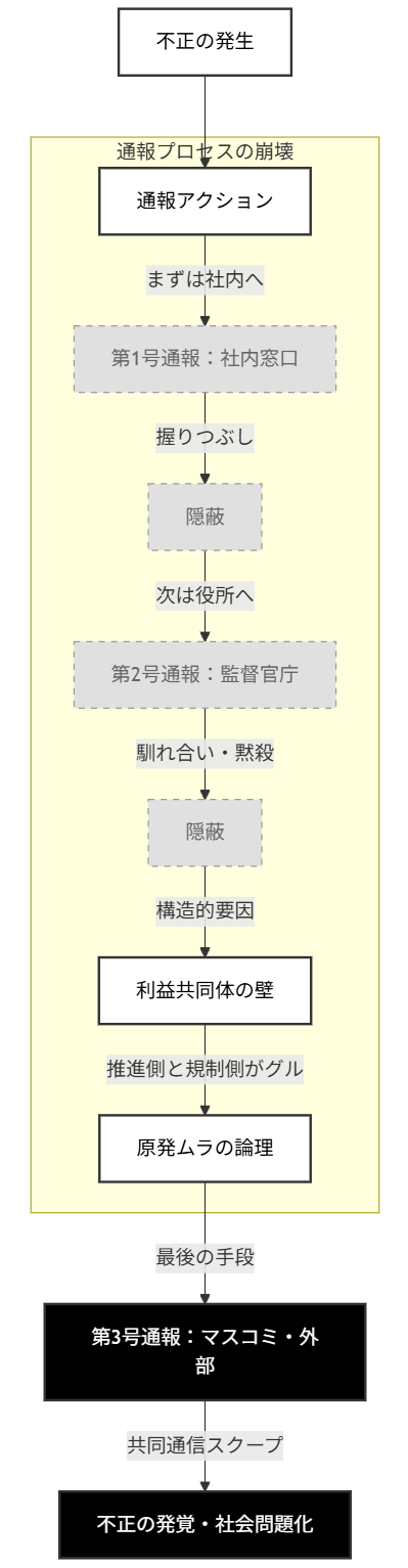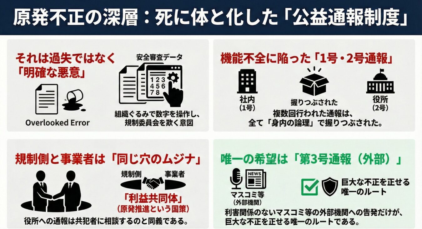 - 共犯関係の露呈:企業(第1号)と役所(第2号)への通報が無視されたのは、両者が「原発推進」という利益共同体の同居人だからである。