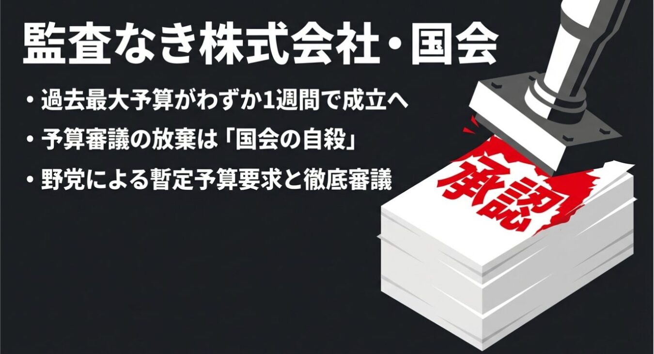 そもそも、内閣が編成した巨額の予算案に対し、国会が厳しくメスを入れて審議することは、憲法に定められた絶対的な義務である。これを株式会社に例えてみよう。代表取締役が提出した杜撰な予算計画に対し、監査役が帳簿も確認せず、内容をろくに精査もしないまま承認印を押し、執行させる。そんな組織は「監査のない株式会社」であり、不正が横行する異常な状態だ。予算審議の放棄とは、国会が自ら監査役としての存在意義を投げ捨てたことを意味する。