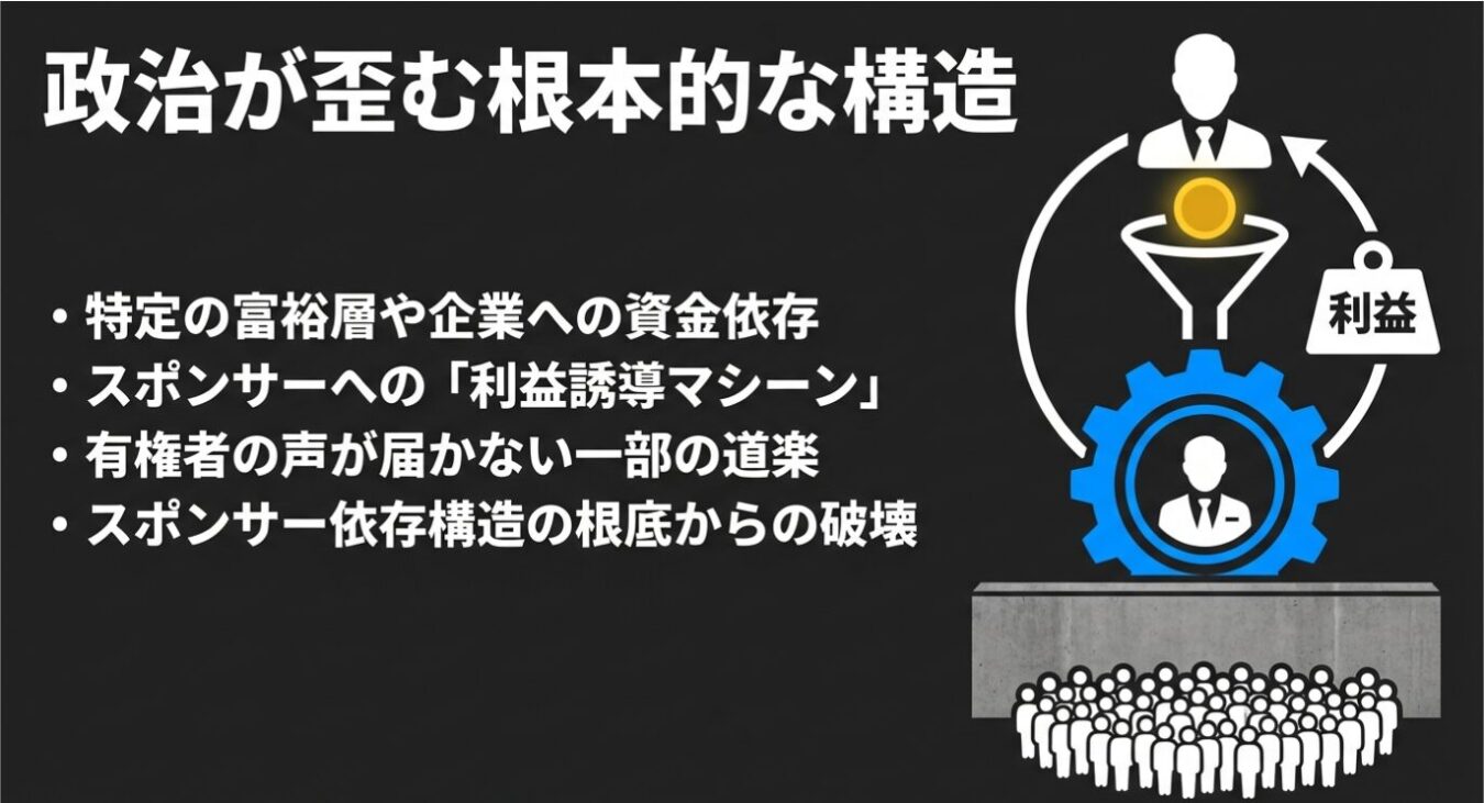政治が「一部の富裕層による道楽」である限り、有権者の声が反映されることはない。特定スポンサーの言いなりになるこの構造を、根底から破壊しなければならない。