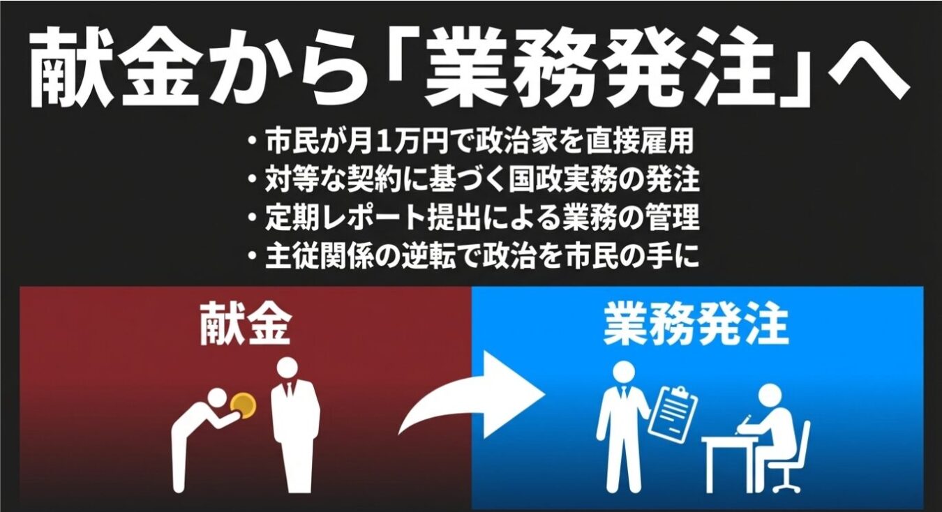 我々がすべきことは、政治家に対する「お小遣い程度の寄付」ではない。必要なのは「献金」から「業務発注」へのパラダイムシフトである。市民が毎月1万円を出し合い、政治家に対し「有権者の声を国政に反映させる実務」を対等な契約に基づき発注するのだ。これこそが『タニマチプロジェクト』の核心である。