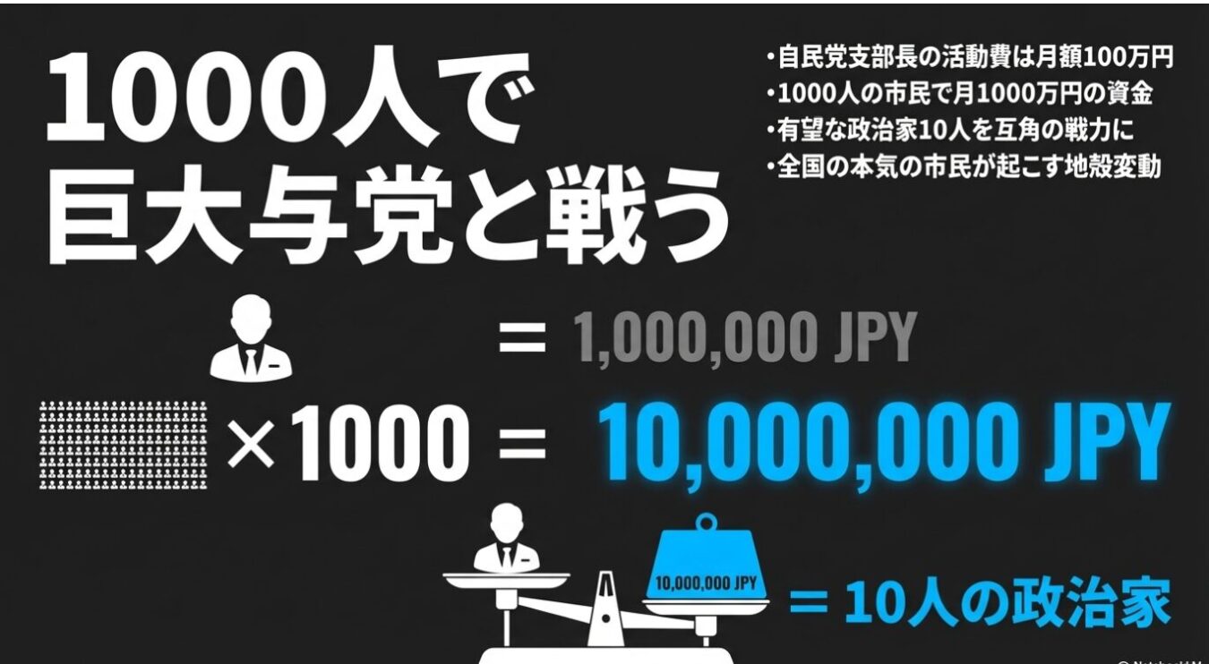 だが、計算してみてほしい。市民が月1万円を出し合い、たった1000人集まるだけで、毎月1000万円の資金が生まれる。この資金があれば、10人の有望な政治家に自民党支部長と同等の月額100万円を支給し、強力な戦力として「雇う」ことが可能だ。日本全国で本気の市民が1000人集まるだけで、巨大与党と互角に渡り合える。このプロジェクトには、それほどのポテンシャルが秘められている。