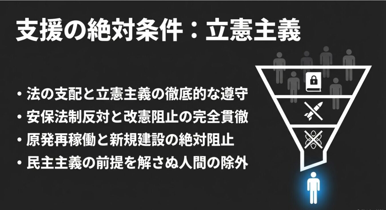 なんでかって言うたら、彼は立憲主義を理解してませんからね 。彼が理解してるのは、民主主義しか理解してませんから 。ということで、そこは絶対に支援対象にはならんので、皆さんご安心ください