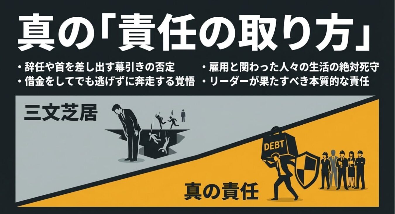 真の責任とは、「人を雇い続け、たとえ借金をしてでも、その雇用と生活を何があっても守り抜くこと」に他ならない。辞めて逃げるのは最も容易な道だ。関わった人々を路頭に迷わせぬよう奔走し続けることこそが、リーダーが果たすべき本質的な「責任」である。