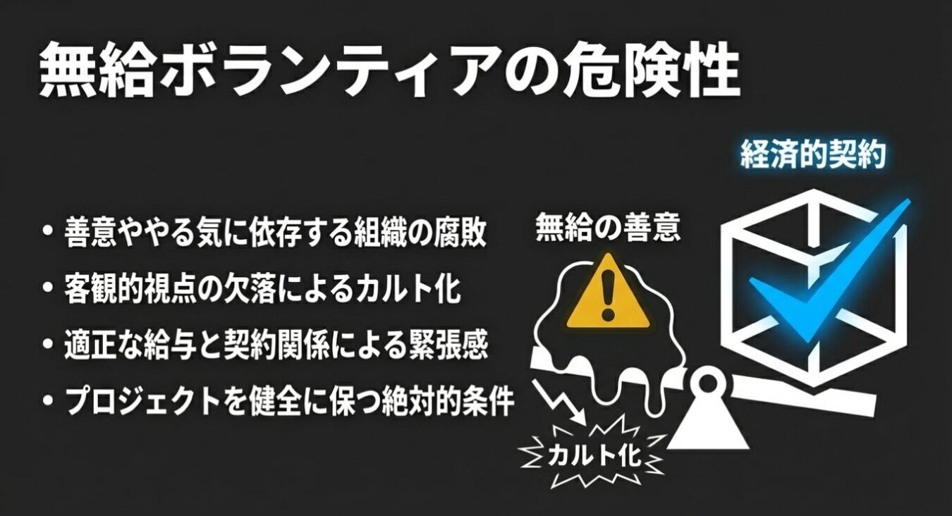 無給のボランティアに依存すると、組織から「対価に見合う仕事をする」というドライで客観的な視点が欠落する。その結果、不健全なカルト状態に陥るのだ。だからこそ、プロジェクトの資金から適正な給与を支払い、人を雇い入れる。この「対価と責任を伴う経済的な契約関係」による緊張感こそが、組織の私物化やカルト化を防ぎ、「タニマチプロジェクト」を単なる一時的な熱狂に終わらせず、持続可能なシステムとして健全に保つための生命線なのである。