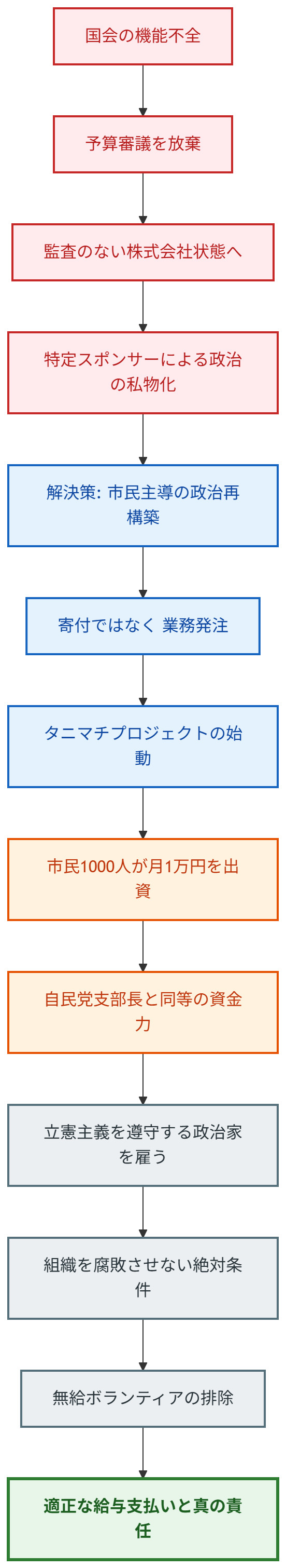 【結論】 国会が憲法上の義務である「予算審議」を放棄し、「監査のない株式会社」に成り下がっている現状において、政治を一部の資産家やスポンサーの利益誘導から市民の手に取り戻すための唯一の解決策が『タニマチプロジェクト』である。市民が自腹を切って政治家に「業務発注」を行い、「雇い主」として彼らをコントロールする。無給のボランティアに依存するカルト的組織論を排し、適正な対価と雇用に基づく「真の責任」を持った組織を構築することで、自民党と対等に戦える強力な政治勢力を生み出すことができる。
