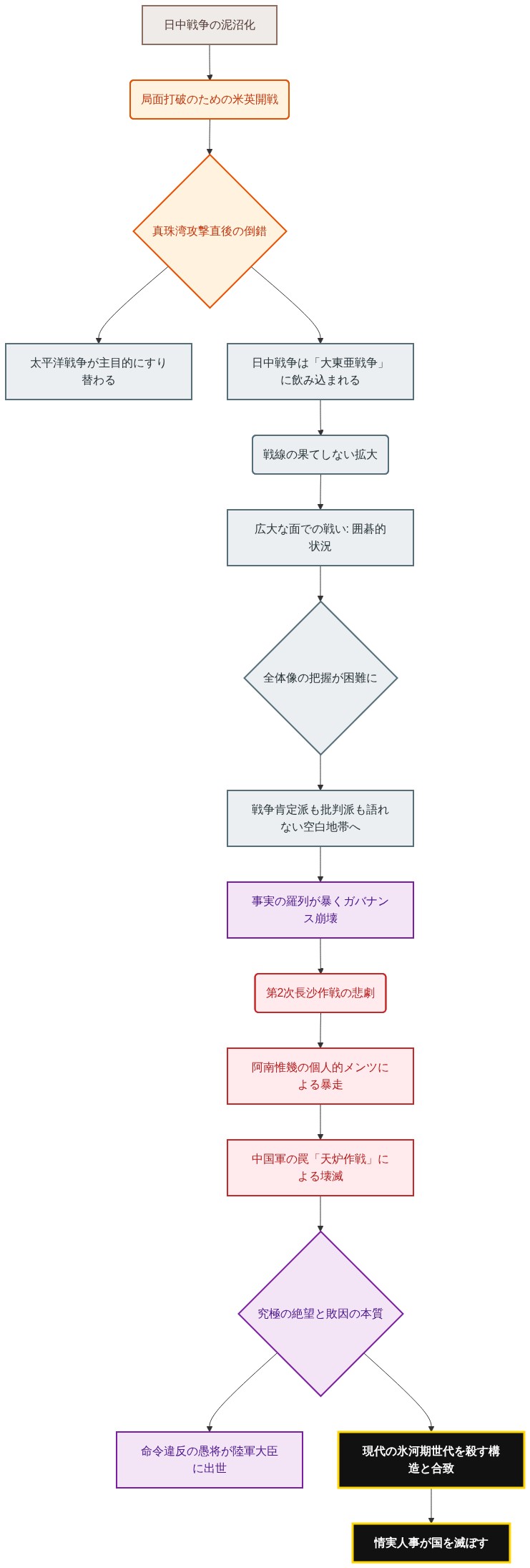 【結論】 大日本帝国が戦争に負けた真の理由は、国力や科学力の低さではなく、メンツと「情実人事」がまかり通る「ガバナンスの完全なる崩壊」にあった。広中一成氏の『後期日中戦争』三部作が突きつける「事実の羅列」は、無能な上層部の自己保身によって現場の優秀な人間が無惨に消費されていく絶望的なサスペンスであり、これは現代の「就職氷河期世代」が直面し、幾人もの命を奪ってきた理不尽な日本社会の構造的欠陥と完全に符合する。