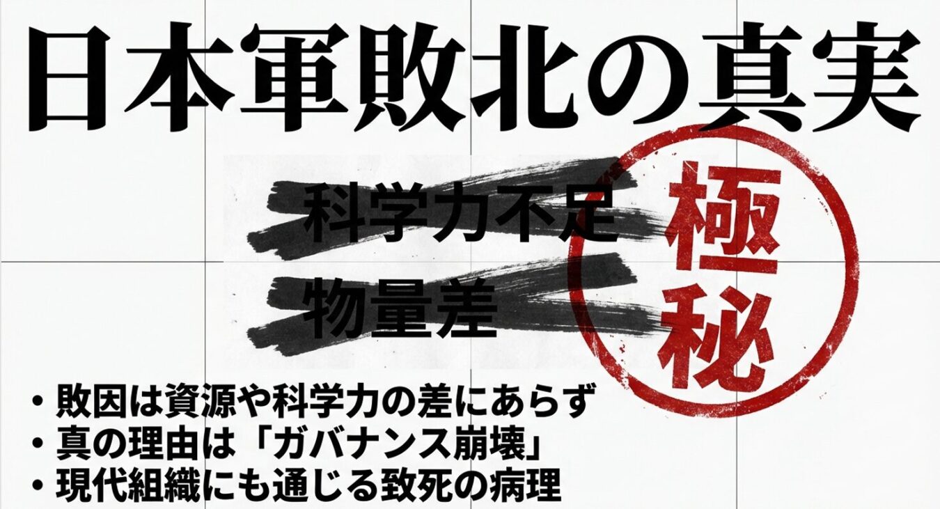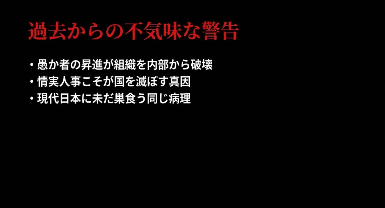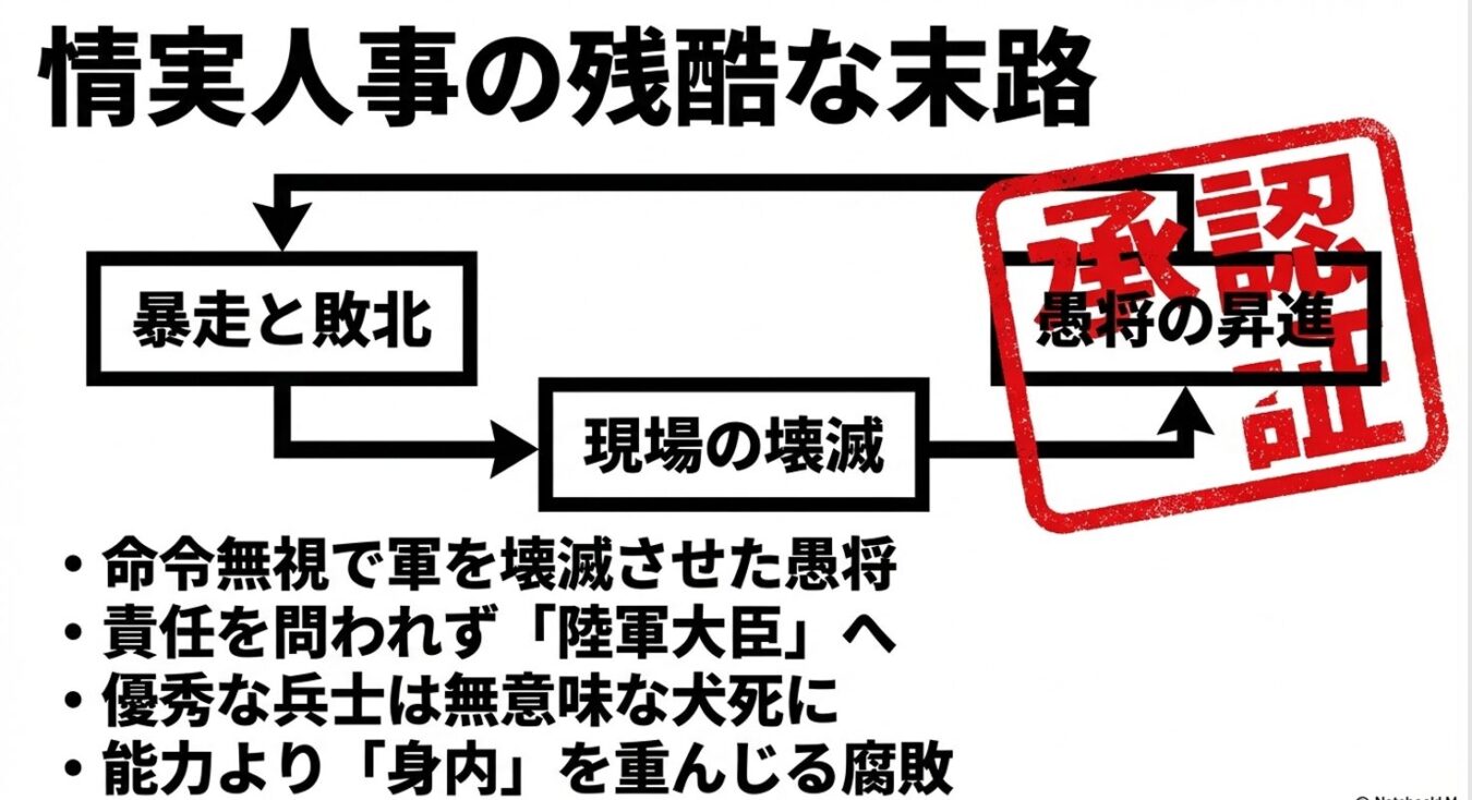 日本が戦争に負けた真の理由は、決して科学力が低かったからでも、国力が劣っていたからでもない。能力や実績ではなく、誰と誰が仲が良いか、誰が身内かという主観的な「情実人事」だけで組織が動いていたからだ。命令違反をした愚将が出世し、優秀な人間が現場で犬死にしていく。これこそが「ガバナンスの完全なる崩壊」であり、この絶望的な体質は、令和の今に至るまで、日本という国の根底に、未だどす黒く横たわり続けているのである。
