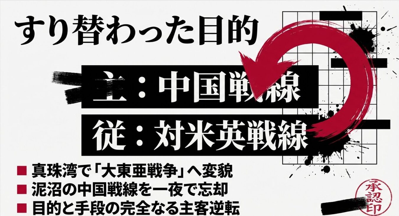 1. 主従関係の逆転と忘却:中国戦線の泥沼化を打破するために米英と開戦したはずが、真珠湾攻撃直後に「大東亜戦争」と呼称をすり替えられ、本来の主戦場であった後期日中戦争は概念的に「後ろ」へ追いやられた。