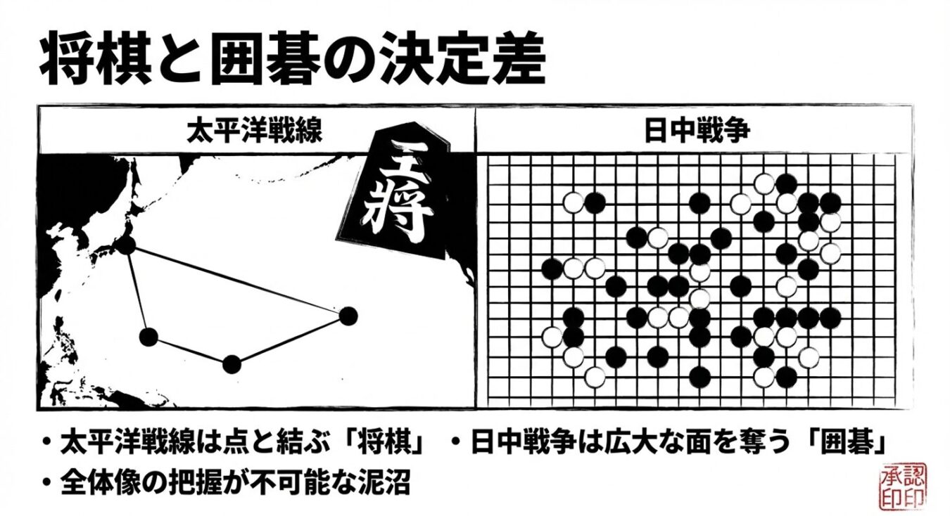 太平洋戦争と日中戦争の決定的な違いは、その戦場の性質にある。太平洋戦争は、点と点(島と島)を結ぶ、いわば「将棋」のようなものだ。海という広大な空白地帯を越えて拠点を奪い合うため、後から戦局の解説や研究がしやすい。