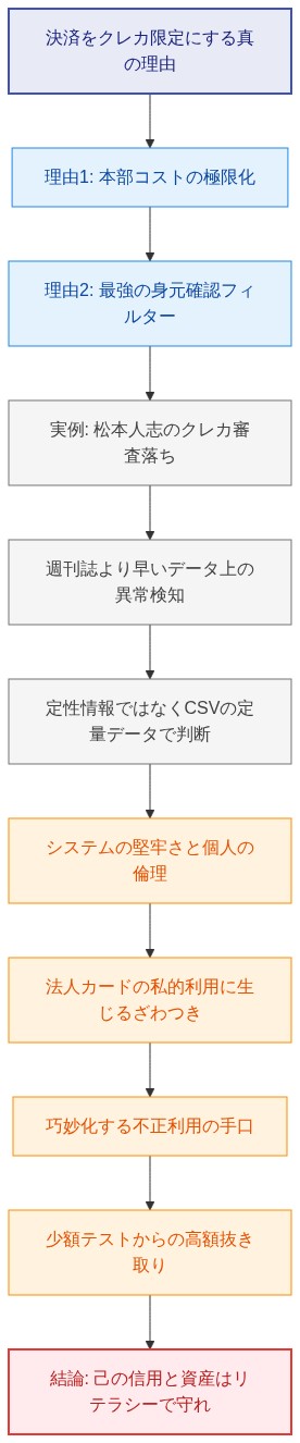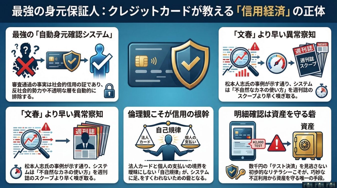 【結論】 クレジットカードの決済システムは、単なる便利な支払い手段ではなく、個人の信用を冷徹なデータ(CSV)で可視化する最強の「身元確認フィルター」である 。松本人志の審査落ちが示すように、システムは噂やスキャンダルよりも早く「異常なカネの流れ」を察知する 。だからこそ、我々はその堅牢なシステムを利用しつつも、個人の倫理観と明細確認というリテラシーで自己防衛しなければならない 。
