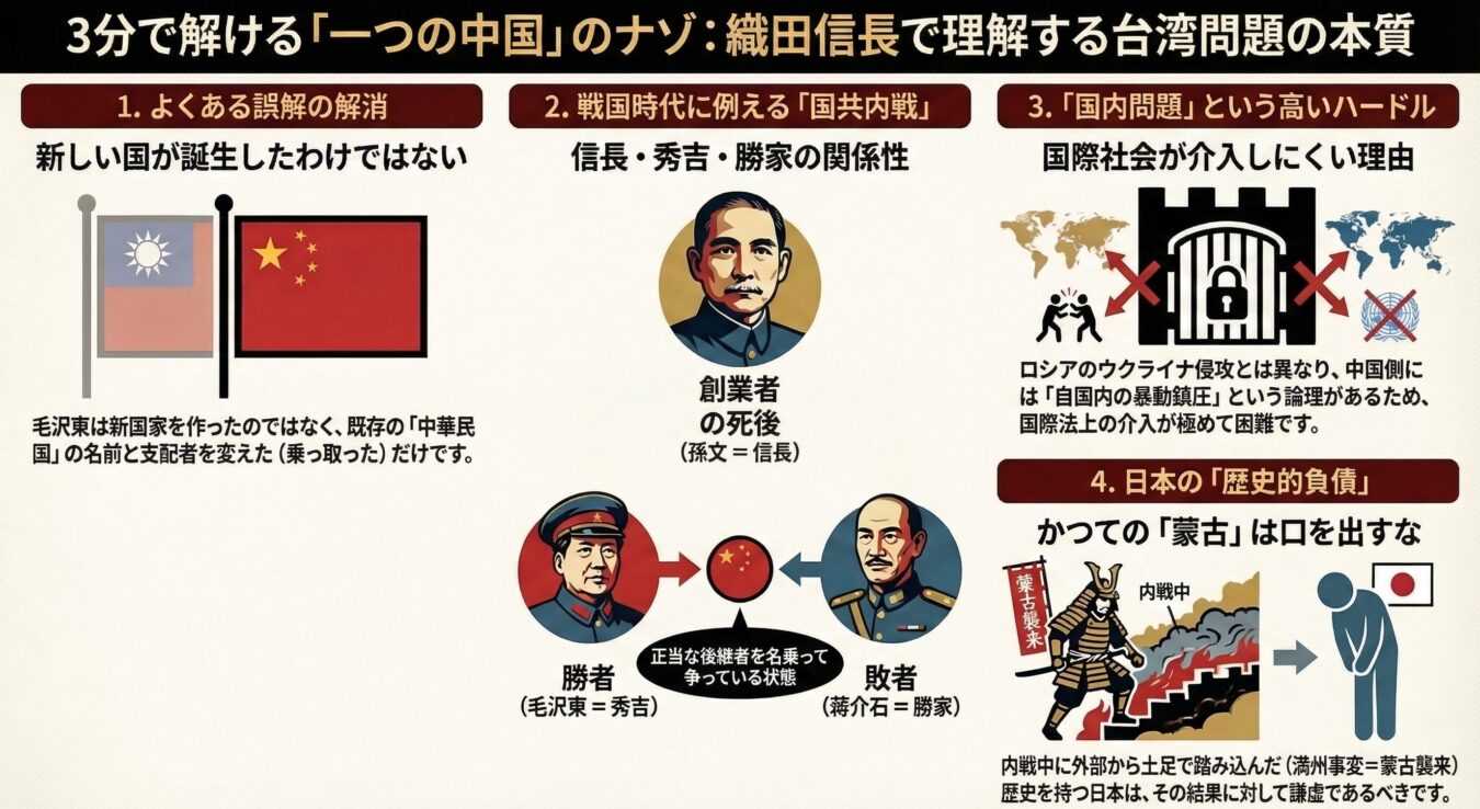 国共内戦が「国内問題」であったという事実は、現代の台湾有事に国際社会が介入することを、構造的に極めて難しくしています。