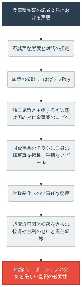 【結論】 兵庫県知事の記者会見から浮き彫りになったのは、対話を拒絶する特異な態度と、自らの功績作りに固執する地方トップの姿である。国の交付金事業を「県の独自施策」としてアピールし、広報チラシに自身の顔写真を掲載させる一方で、財政悪化の責任は過去の県政に転嫁している。これは地方自治におけるリーダーシップの欠如を如実に示している。