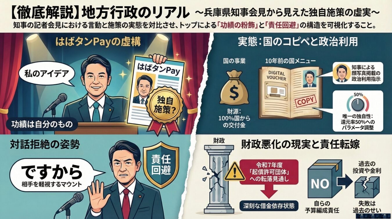 知事が自らの輝かしい功績としてドヤ顔で語る施策がある。それがはばタンPay+(プレミアム付きデジタル商品券)だ。知事はこれを兵庫県が独自に考案し、県民の家計を支えるために実施したかのように喧伝してきた。しかし、一皮むけばその実態は完全なる虚構である。