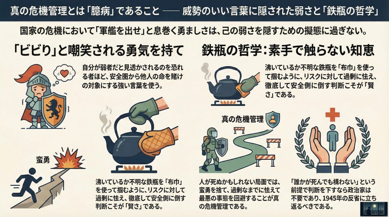 【結論】 国家の危機や理不尽な外圧に直面した際、威勢のいい勇ましい言葉を吐く人間は、単なる「想像力のない弱者」に過ぎない。真の危機管理とは、人の血が流れる可能性の前に過剰なまでに怯え、臆病に振る舞うことであり、政治家という職業の本懐は己のキャリアを懸けて「絶対に人を死なせないこと」にある。