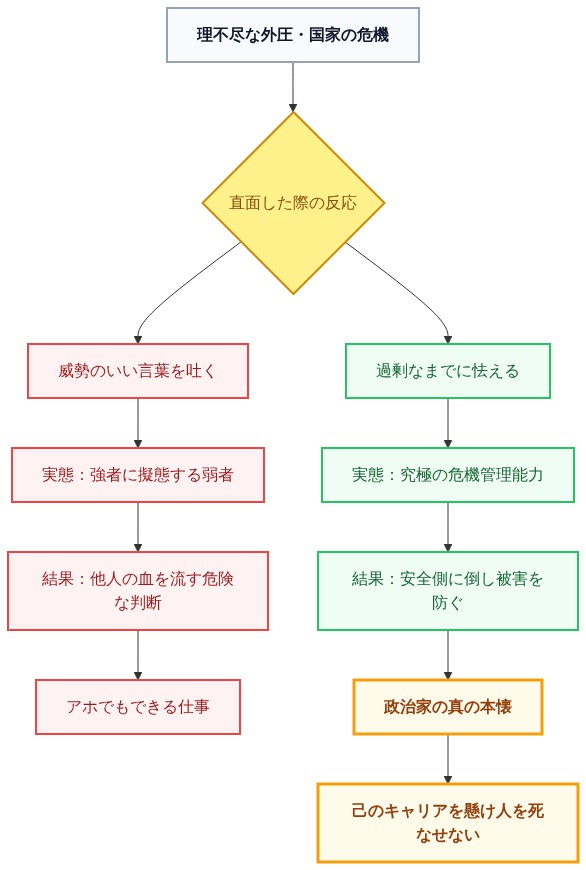 【結論】 国家の危機や理不尽な外圧に直面した際、威勢のいい勇ましい言葉を吐く人間は、単なる「想像力のない弱者」に過ぎない。真の危機管理とは、人の血が流れる可能性の前に過剰なまでに怯え、臆病に振る舞うことであり、政治家という職業の本懐は己のキャリアを懸けて「絶対に人を死なせないこと」にある。