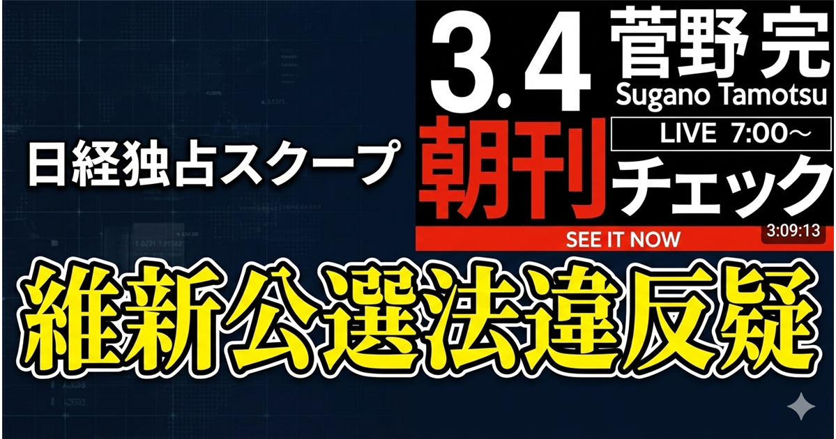【結論】 国際的な緊張状態の裏で、日本の国内政治では自民党・維新の会による連立与党の「むちゃくちゃな」国会運営と選挙違反疑惑が進行しています。特に、普段は経済報道を中心とする日経新聞が、維新の公選法違反疑惑をかつてない熱量で猛批判している点は極めて重要です。また、予算案の強行採決と消費税減税の先送りという、理屈の破綻した政治姿勢も浮き彫りになっています。