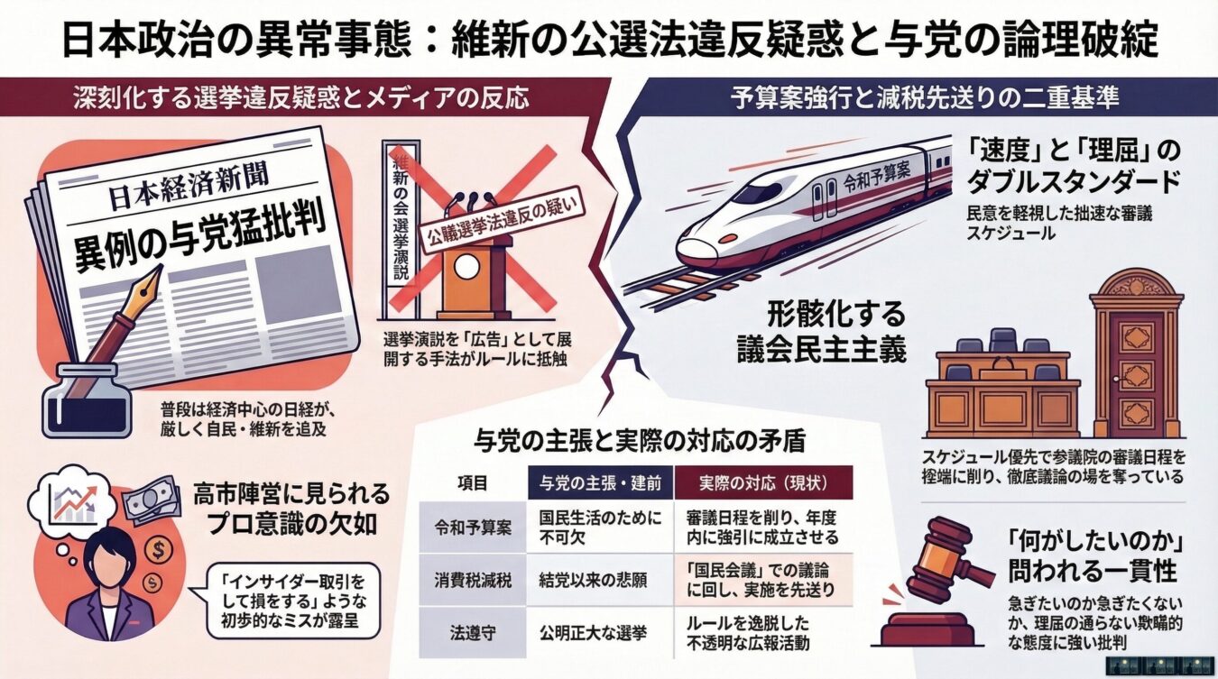 【徹底解説】日経新聞が異例の猛批判!維新の公選法違反疑惑と、予算案強行に見る与党の矛盾