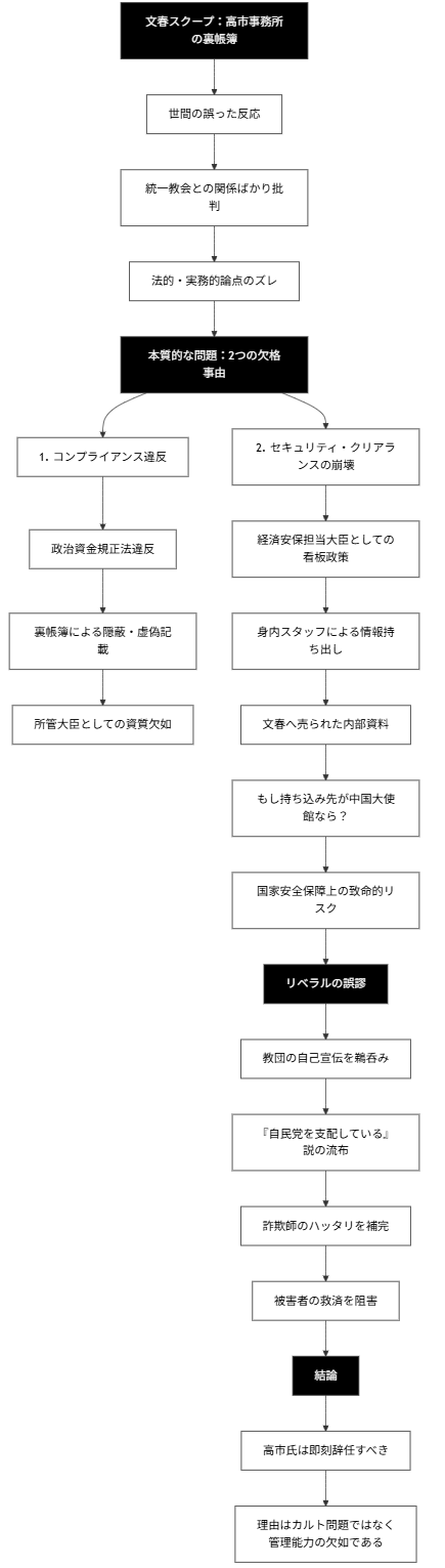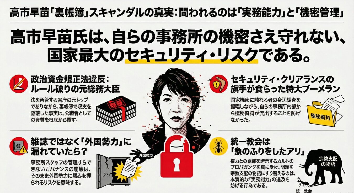 【結論】 高市早苗氏の「裏帳簿」疑惑の本質は、統一教会との関係ではない。彼女が推進した「セキュリティ・クリアランス(適性評価)」の観点において、自身の事務所から機密情報が持ち出されたという「情報管理能力の欠如」こそが致命的である。また、統一教会のプロパガンダを真に受けて騒ぐリベラル層は、カルトの権威付けに加担しているに過ぎない。