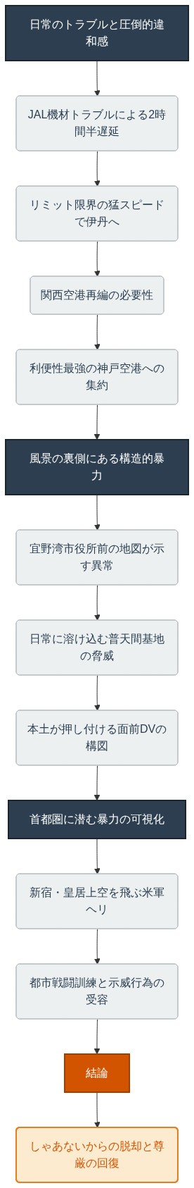 日常の空港アクセスの不便さも、国家の根幹を揺るがす軍事基地の押し付けも、根底にあるのはそういうものだからしゃあないと無気力に受け入れてしまう私たちの精神の敗北である。圧倒的な暴力や不条理を前にして思考を停止させ、自らの尊厳を守ることをやめてしまった面前DVの後遺症から、私たちは今すぐ目を覚まさなければならない。目の前の事実から目を逸らさず、おかしなことにはおかしいと声を上げる。そこからしか、このいびつな構造を打破する道は開かれないのである。