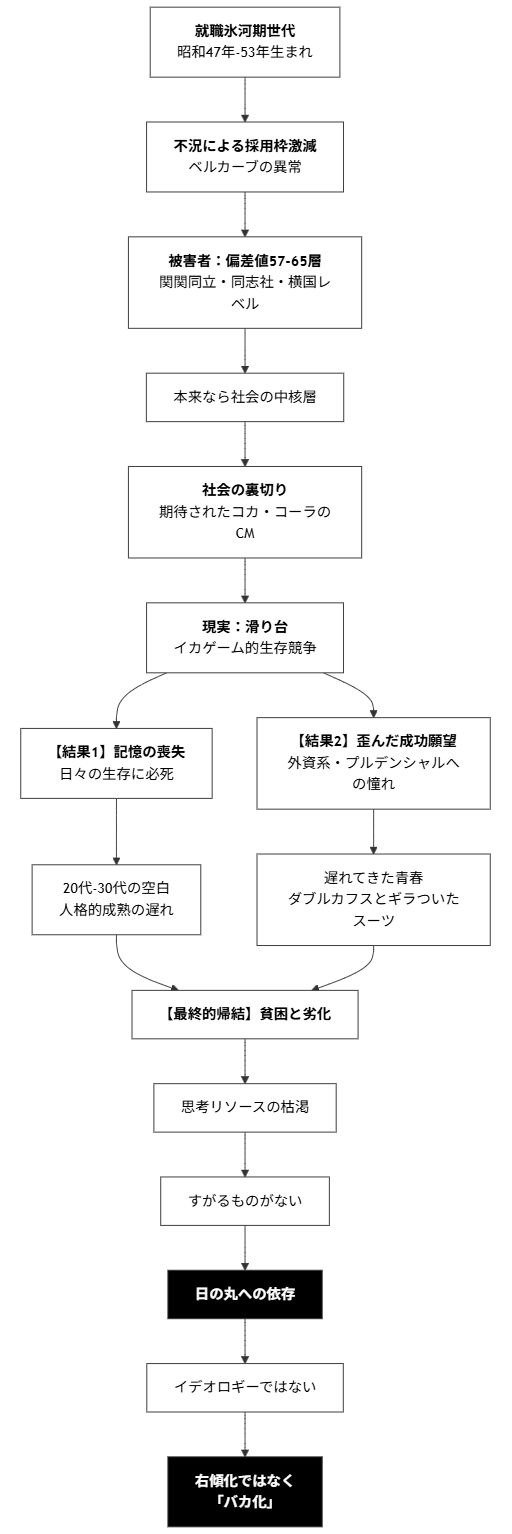 【結論】 現在、日本社会で観測されている現象は、イデオロギー的な「右傾化」などという高尚なものではない。それは、かつて社会の中核を担うはずだった氷河期世代を徹底的に搾取し、貧困化させた結果、知性と記憶を奪われた人々が最後に「日の丸」にすがりつかざるを得なくなった「バカ化(知性の劣化)」の末路である。