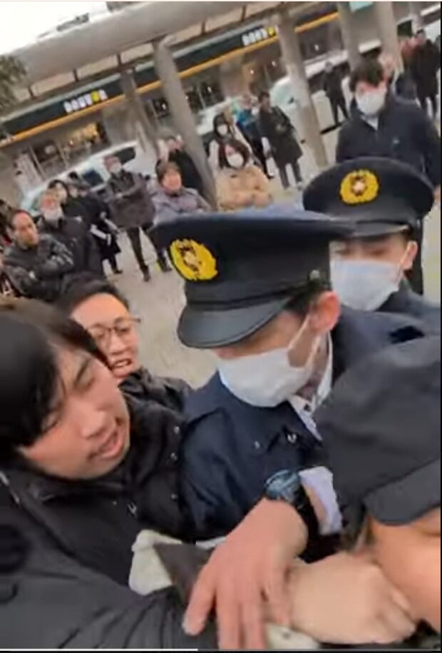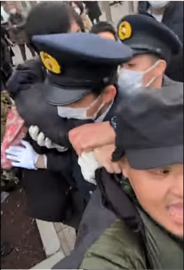 先日、あるプロテスター(抗議者)が撮影した一枚の写真が話題になった。維新の支持者が、抗議者の襟首を掴み、警察の制止も聞かずに首を絞め上げんばかりの形相で恫喝している写真だ。
