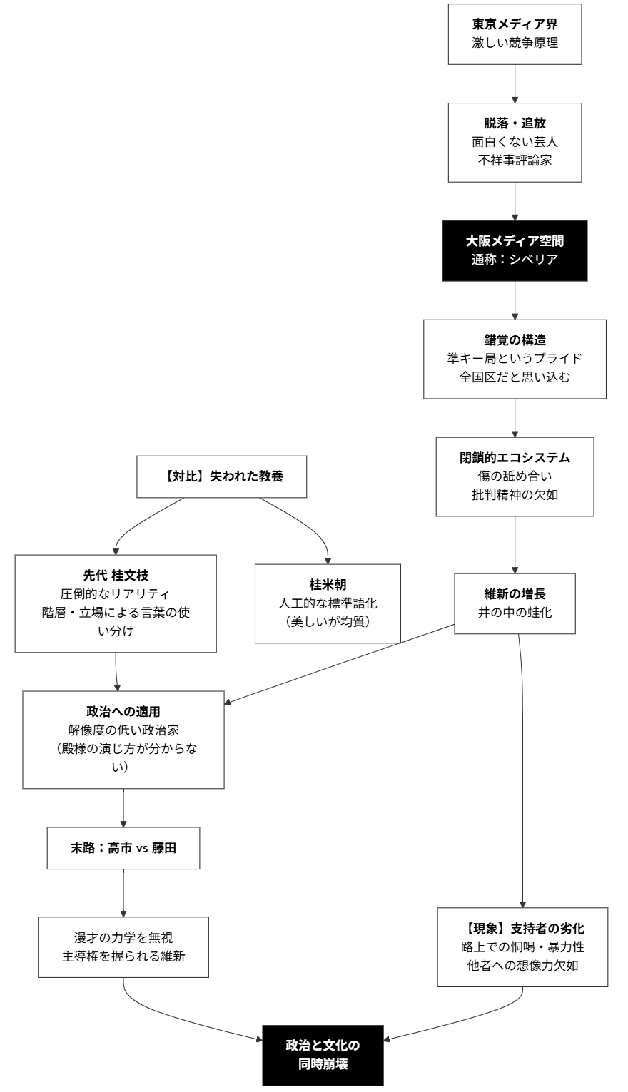 【結論】 大阪の政治的異形(維新)を育てたのは、東京からあぶれた人間が吹き溜まる「シベリア」と化した大阪メディアの閉鎖性である。また、落語や漫才といった古典芸能が持つ「人間関係の機微」や「階層のリアリティ」を読み解く教養が失われたことで、政治家と支持者の質は底なしに劣化している。