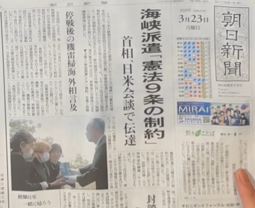 今回の首脳会談における最大のトピックは、間違いなく中東情勢でした。トランプ氏の圧力に対し、日本政府はどう動いたのか。朝日新聞の一面が報じた通り、高市氏はトランプ氏に対し「ホルムズ海峡に艦船を派遣するのは、憲法9条の制約があって不可能だ」と明確に伝えています。