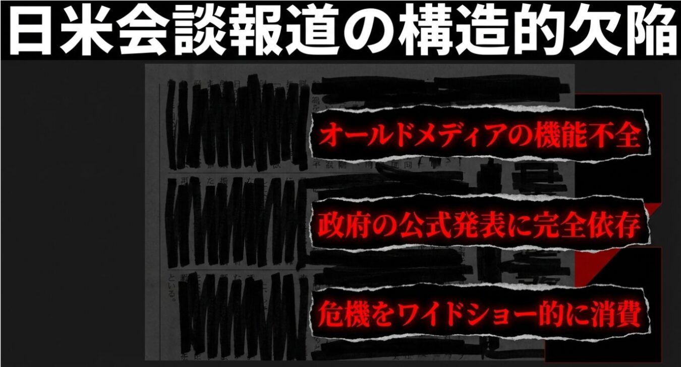 速報性を重視するあまり、米国側の生々しい主張や交渉の裏側を独自に深掘りするリソースも能力も欠如しているのです。結果として、日本政府にとって都合の良い、あるいは当たり障りのない公式発表だけが右から左へと垂れ流されることになります。流動的な交渉の最中に、核心を突いた詳細な情報が政府側から開示されるはずがないのです。