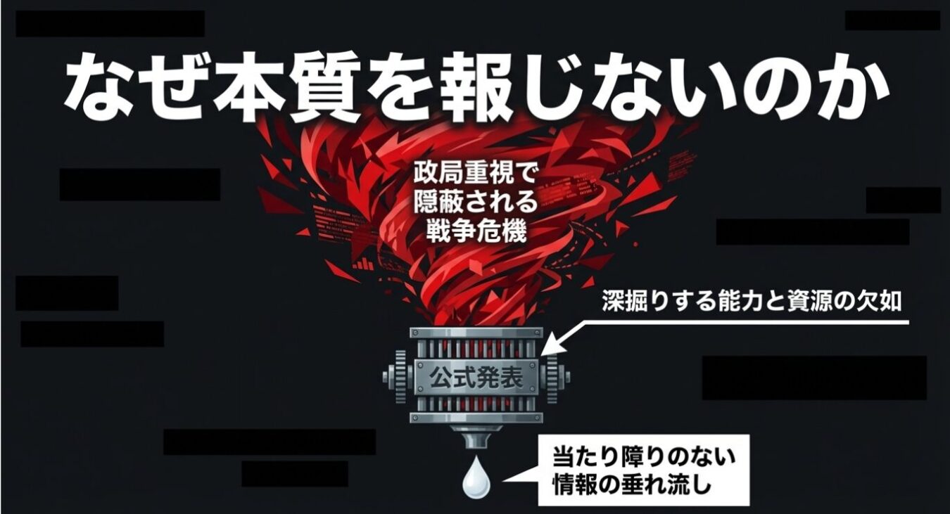 しかし、オールドメディアはありのまま報じることに謎の罪悪感を覚えるのか、無理やりワイドショー的な対立構造や、薄っぺらい人間ドラマを付加しようと試みます。本質的な戦争の危機が目前に迫っているというのに、政治家の表面的な振る舞いや「どちらが優位か」といった政局重視の矮小化された議論へと、情報を劣化させているのです。これは情報の隠蔽にも等しい重罪と言わざるを得ません。