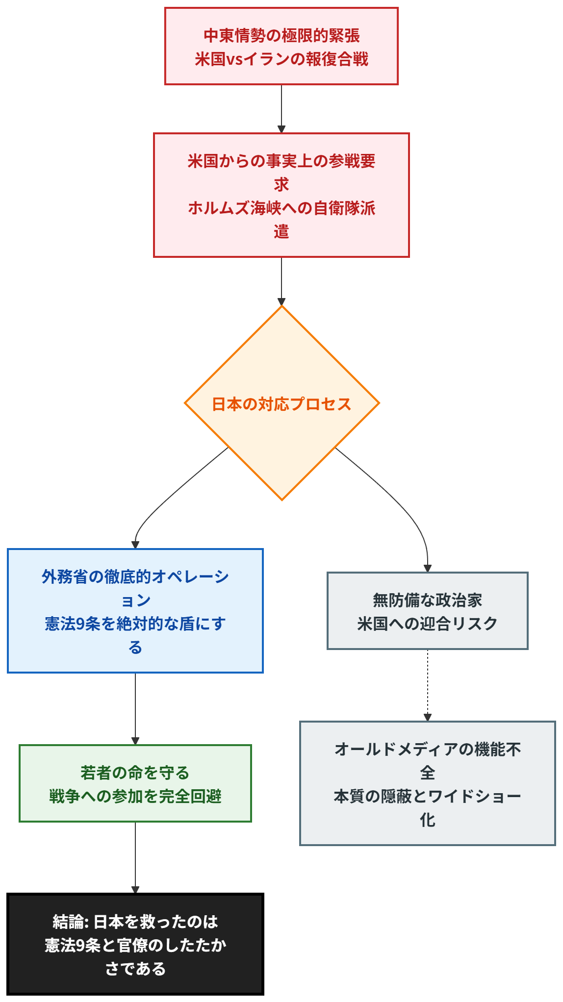 【結論】 先日の日米首脳会談の本質は、メディアが報じるような表層的な外交論議ではありません。実際には、中東での「ガチの戦争」に日本が巻き込まれそうになった極めて危険な事態でした。そして、無防備な政治家をコントロールし、若者の命を確実な死から救い出したのは、「憲法9条」という絶対的な盾と、それを巧妙に使いこなした外務省官僚の「完璧なオペレーション」です。オールドメディアの報道は、この最大の危機と本質を完全に隠蔽しています。