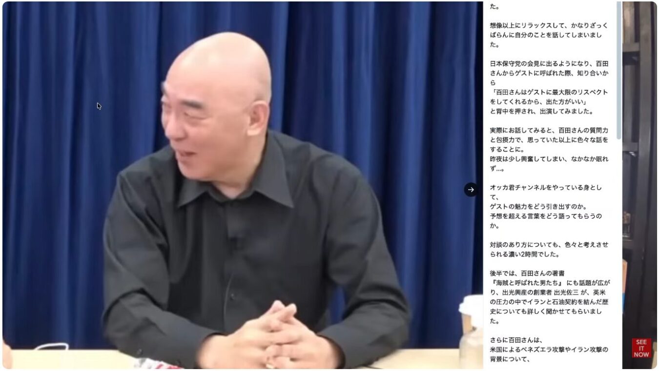 「いや、いそこ(望月衣塑子記者)はね、もう完全アウトですよ !ニコニコ動画の百田尚樹の番組に出て対談してね 、『真珠湾攻撃前、米国が日本への石油輸出を全面禁止した歴史に触れながら、エネルギーと国際政治の関係について話が広がりました』って…もうアウトでしょ !