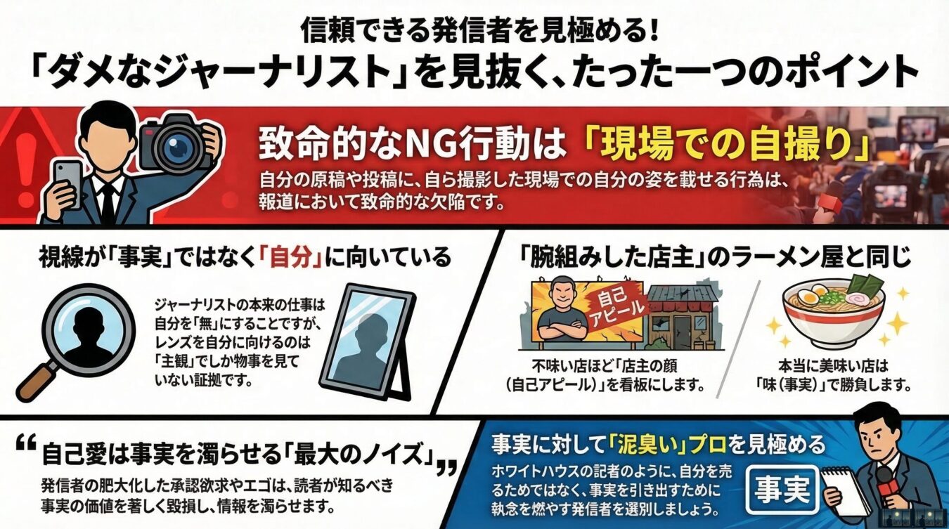 【結論】 ジャーナリストが自身の原稿に「現場での自撮り」を掲載することは、視線が事実ではなく自身に向いている決定的な証拠であり、報道の主体を私物化しているため絶対に信用してはならない 。