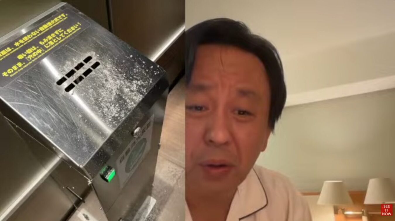 喫煙所にある水を使わない自動消火式の灰皿と、それについて話しているパジャマ姿の菅野完の映像。
