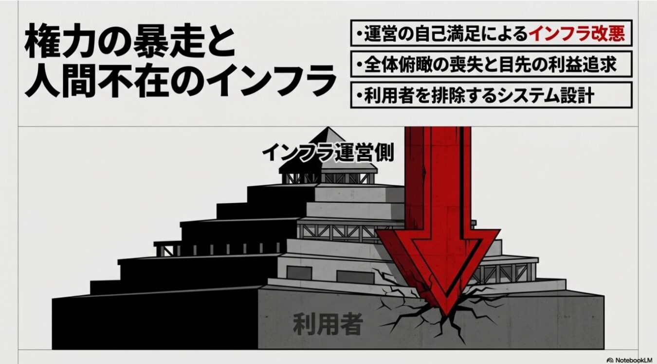 ピラミッド状の巨大な構造物の上から巨大な赤い矢印が突き刺さり、下の層にいる利用者を押しつぶしている様子と、「権力の暴走と人間不在のインフラ」という見出しおよび3項目の問題点が記された図。