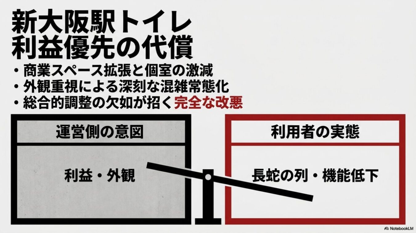 新大阪駅のトイレ改修における、運営側の利益・外観優先が利用者の利便性低下を招いているという批判的な分析を示した図。