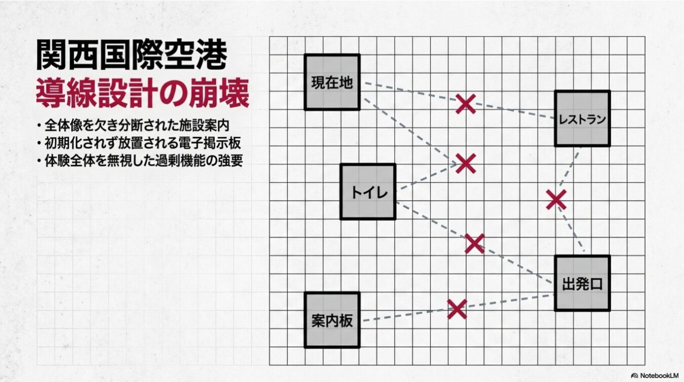 関西国際空港の導線設計の崩壊をテーマに、施設案内や電子掲示板の課題を箇条書きで示し、右側に各施設間をつなぐ線上にバツ印が記された格子状の図を配置したインフォグラフィック。