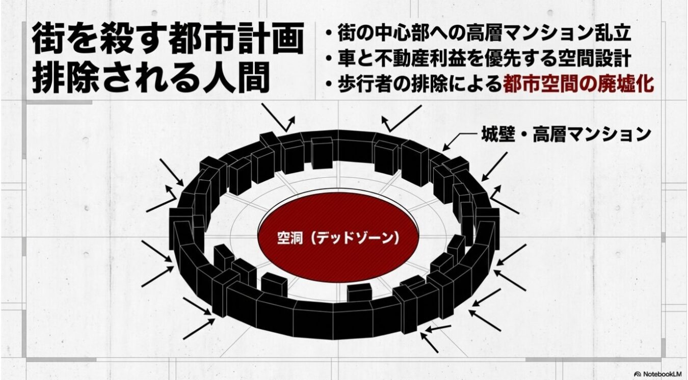 都市計画による弊害を批判する図解であり、中心部の空洞(デッドゾーン)を囲むように高層マンションが連なり、外側から都市空間を圧迫する様子が描かれています。