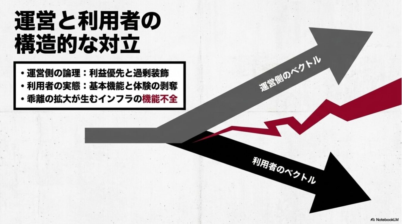 「運営と利用者の構造的な対立」という見出しの下に、利益を優先する運営側と体験が損なわれる利用者側の方向性が正反対に乖離していく様子を、2つの矢印と折れ線グラフで示した図解。