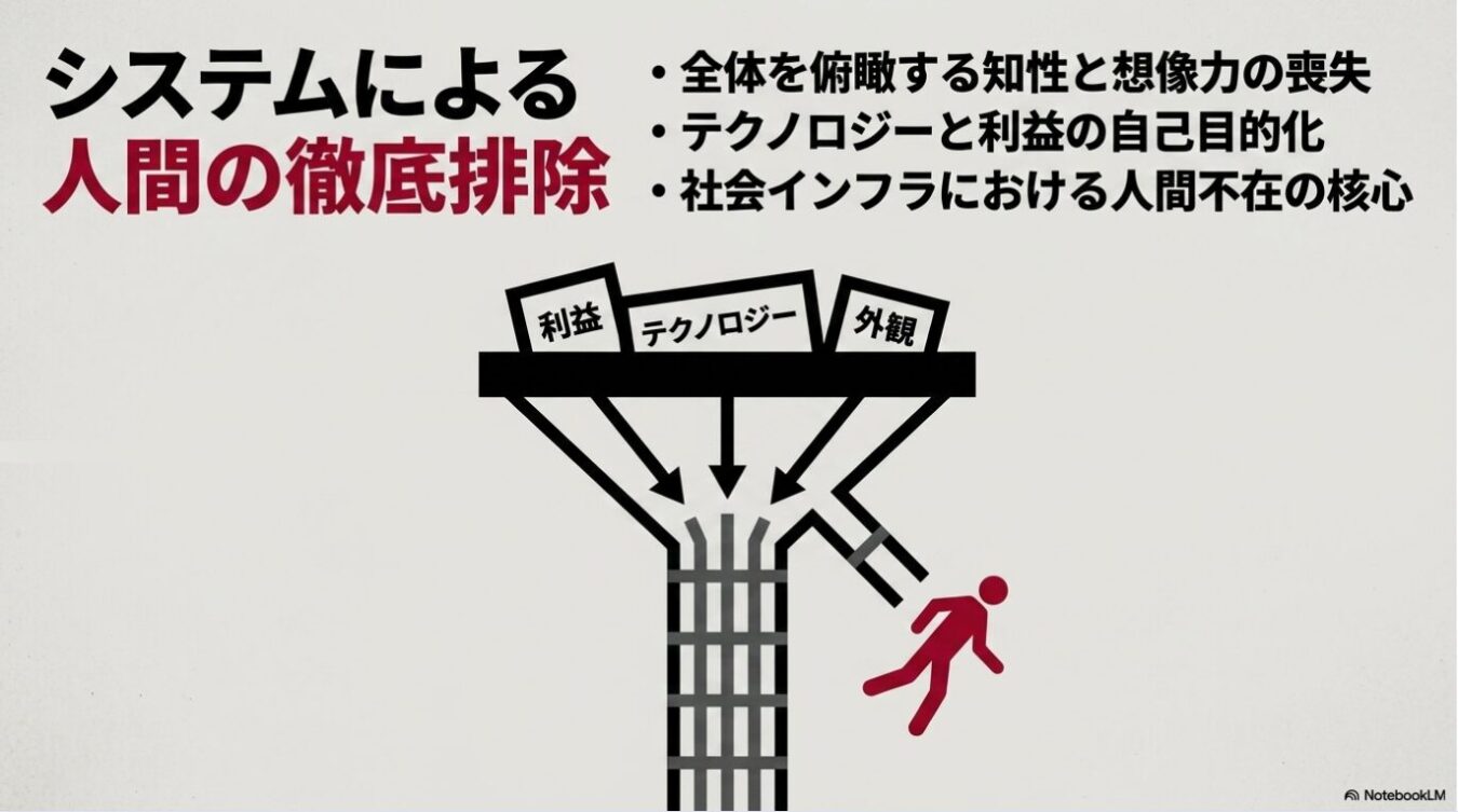 「システムによる人間の徹底排除」という見出しとともに、利益・テクノロジー・外観の要素が統合されて社会インフラを形成する一方で、そこから人間が排除される様子を描いた図解。