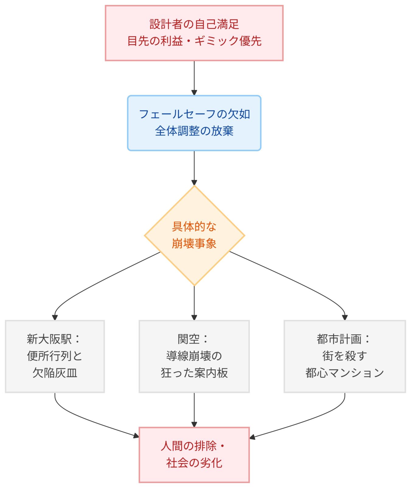 設計者の独りよがりな計画から始まり、フェールセーフの欠如を経て、新大阪駅、関空、都市計画の具体的な崩壊事象へと至り、最終的に社会の劣化を招くプロセスを示すフローチャート。