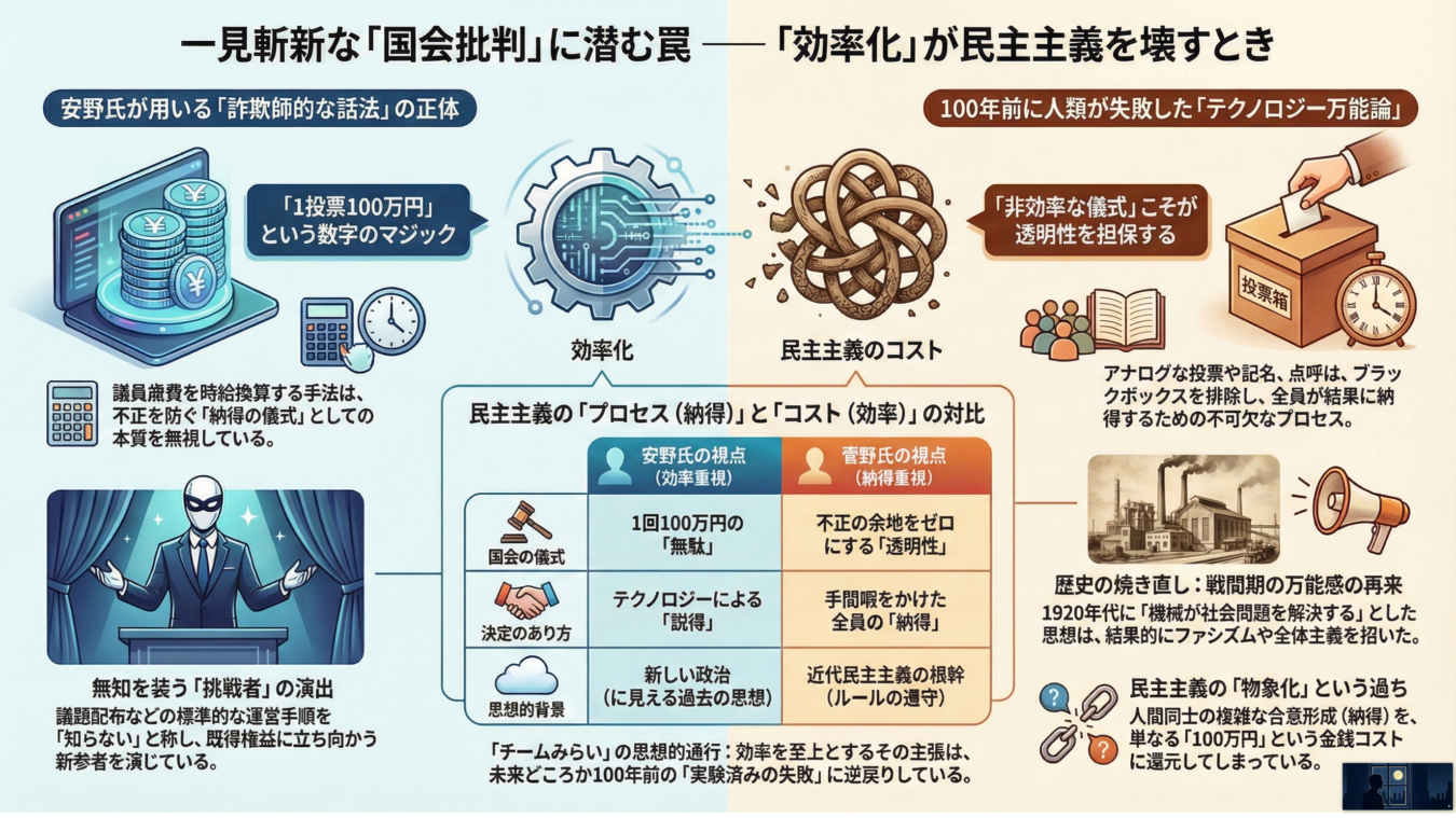 【結論】 安野貴博議員による「国会改革」の提言は、一見すると合理的で現代的なアップデートに見えるが、その実態は民主主義の根幹である「納得のプロセス」をコストと切り捨てる極めて危うい思想である。100年前に人類が経験し、全体主義という悲劇を招いた「効率至上主義」の焼き直しに過ぎず、我々はその「詐欺師的話法」と「思想的退行」を見抜かなければならない。