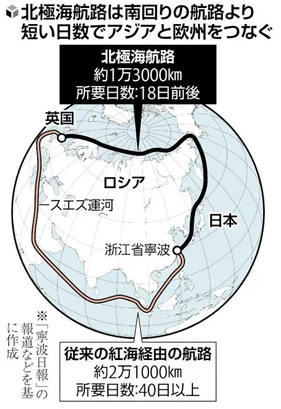 - 経路と時間短縮: 北極海経由の貨物輸送を利用することで、中国からイギリスまで20日間で到着したという報告があります。これは、従来の中東ルートの半分の時間で済むことを意味しています。